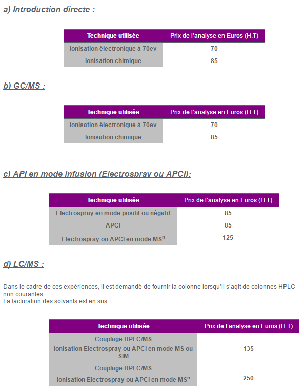 Le prix comprend, pour chacune des expériences réalisées, le temps d’occupation de l’appareillage, la mise au point, ainsi que le traitement et la rédaction du compte-rendu d’analyse. La liste des expériences citées ci-dessous sont les plus courantes et répondent à la majorité des demandes, cependant, il est possible d’aborder des problèmes plus spécifiques au cas par cas.